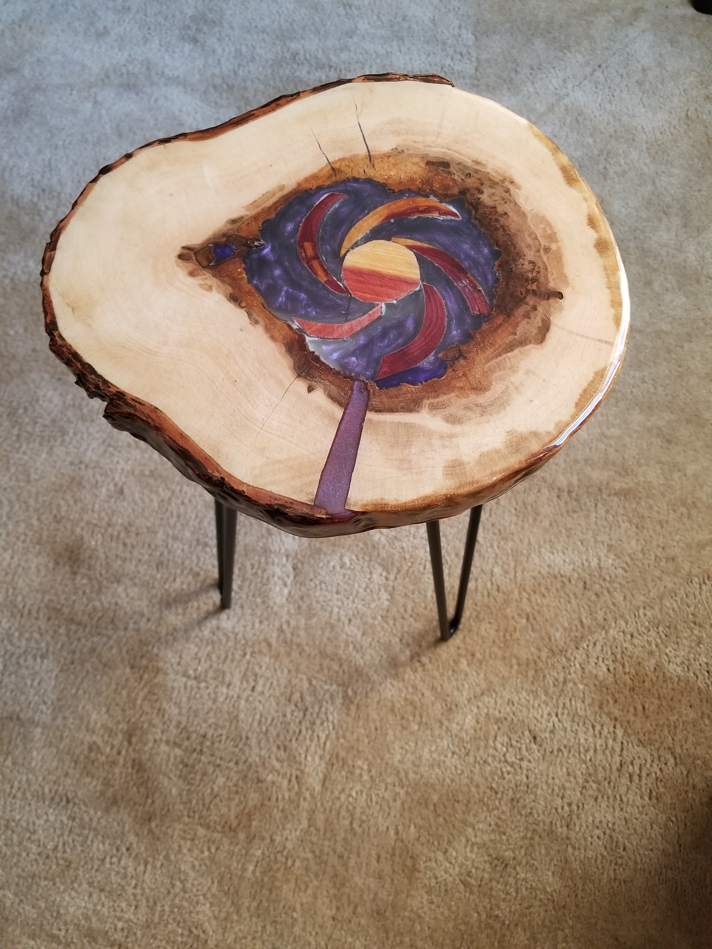 This beautiful tabletop or stool is filled and coated with many layers of tabletop a poxy will hold up to 300 pounds has 3 legs with rubbers to not scratch the floor Also has a hollowed out middle so you can add lights if you want to really make it glow.