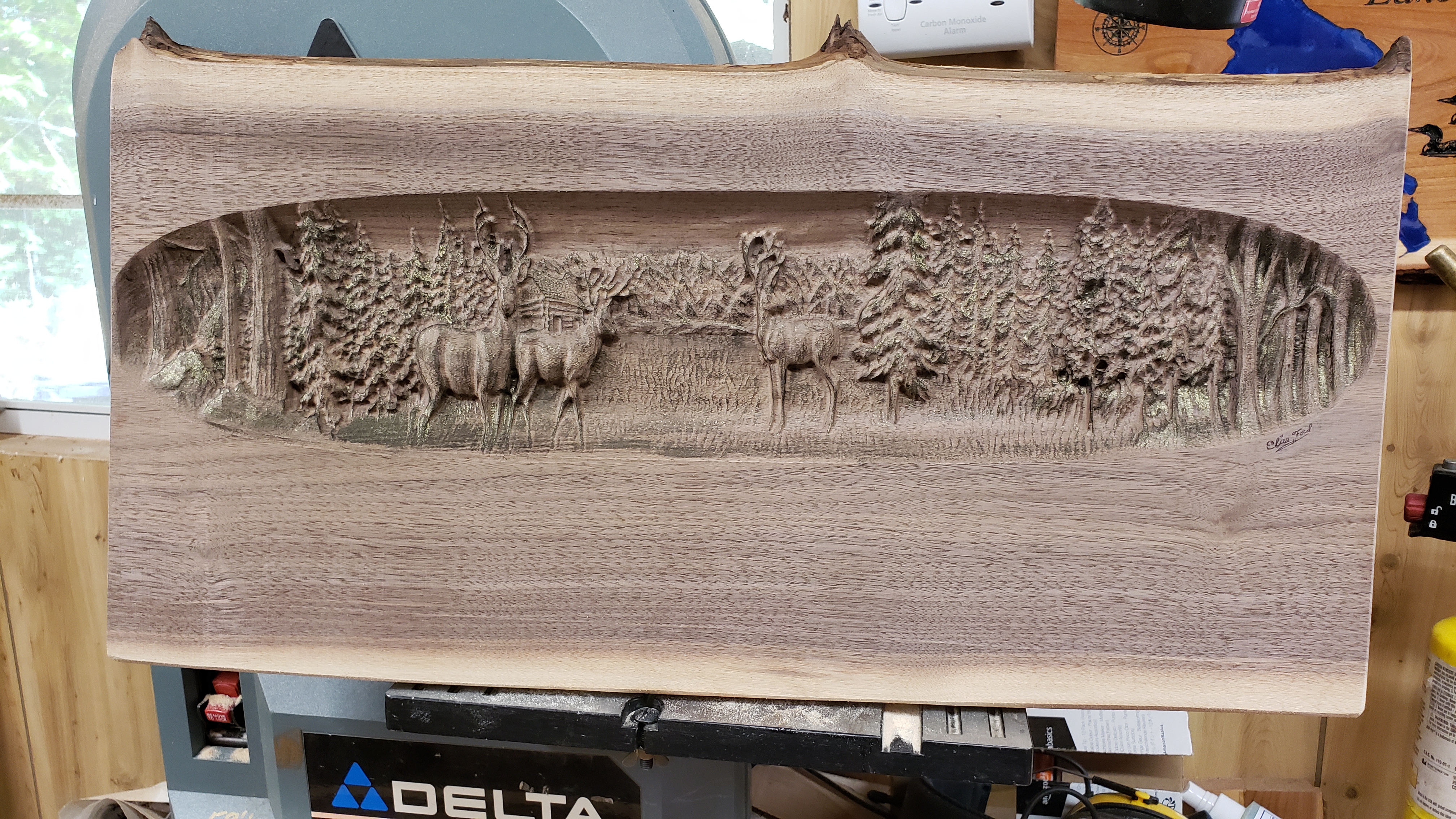 Black Walnut 3D Carving w Deer and Cabin in the Woods. Still Avail.
