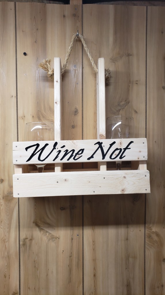 Wine baskets, light and classy. Comes with 2 glasses. They can hold 3 bottles of wine, or 3 glasses, or 2 glasses w wine bottle in the middle, walk and swing, they all stay secure.. just don’t fall down. $40