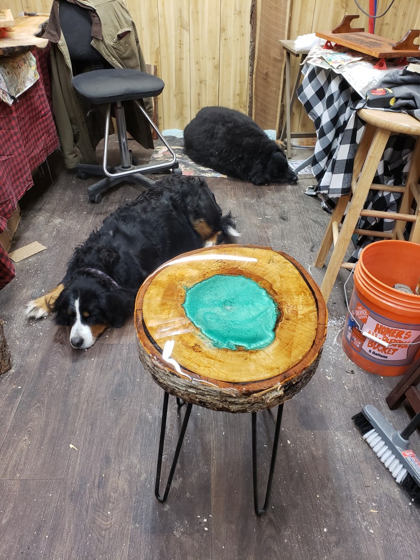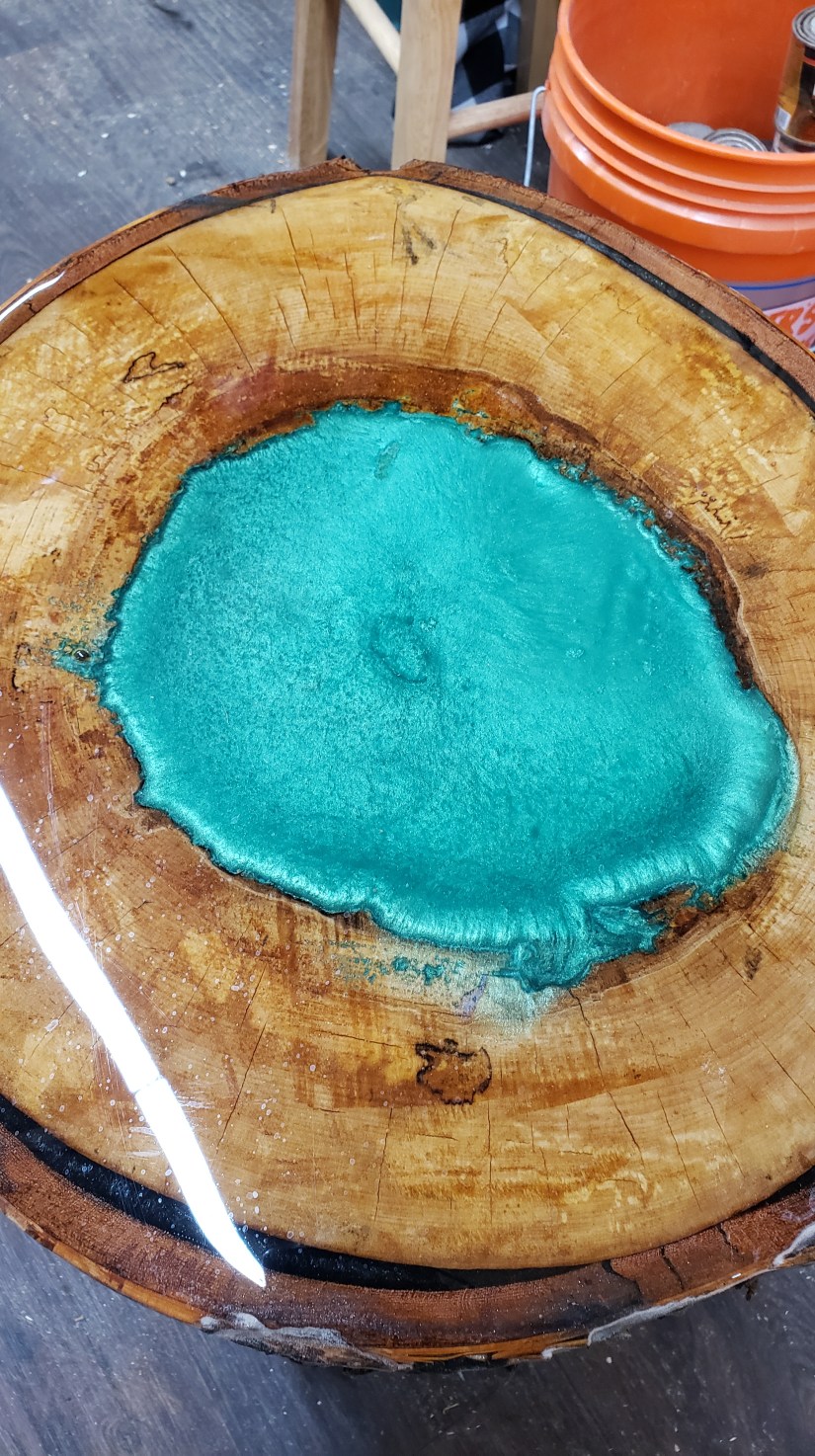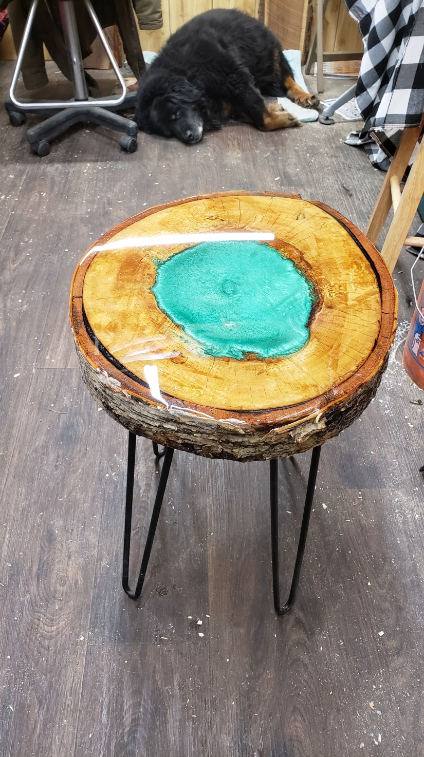 Epoxy end table w Emerald green center on White Birch 21″ tall , 16″ wide. $265. I can make more from same log. text me if interested. 603-759-4606.