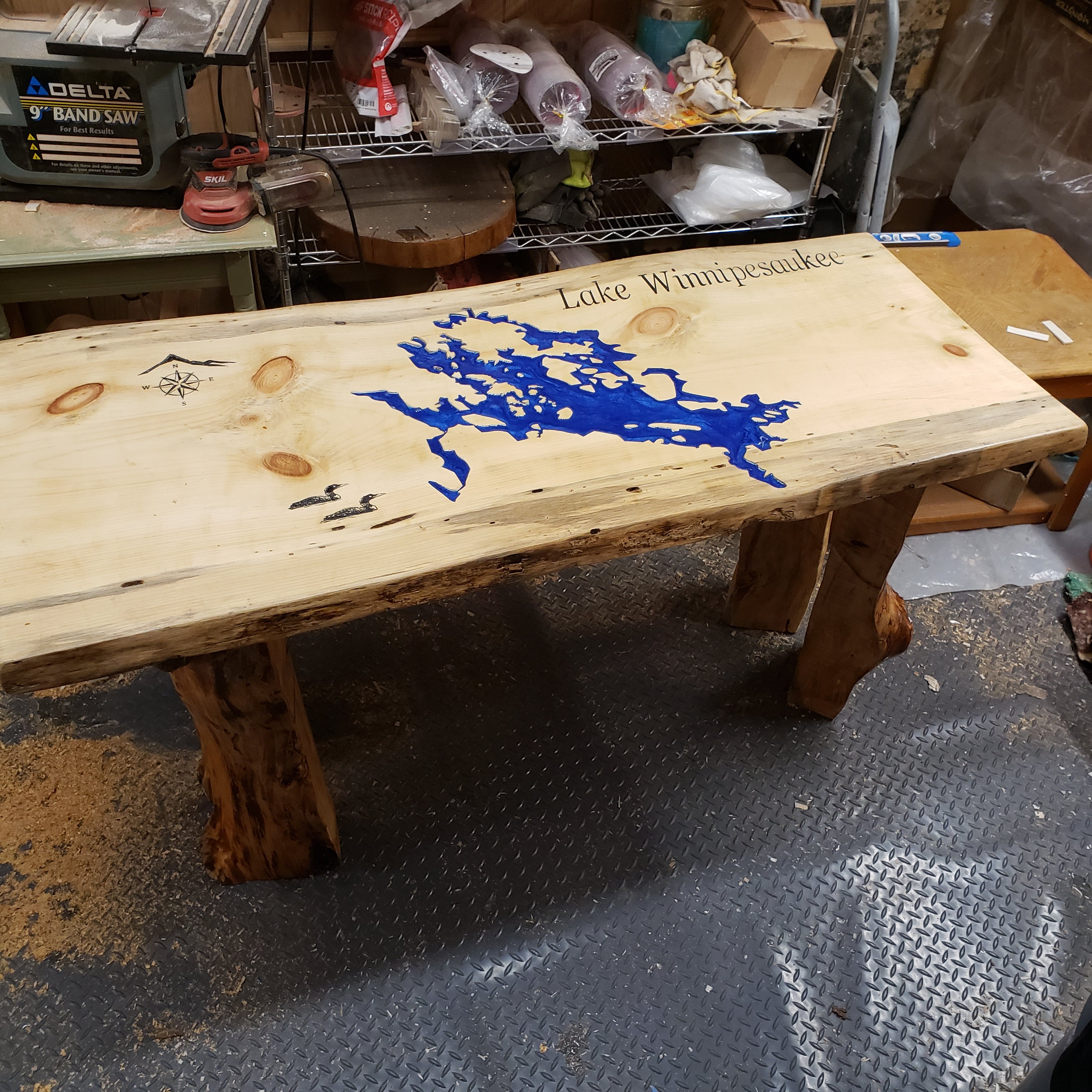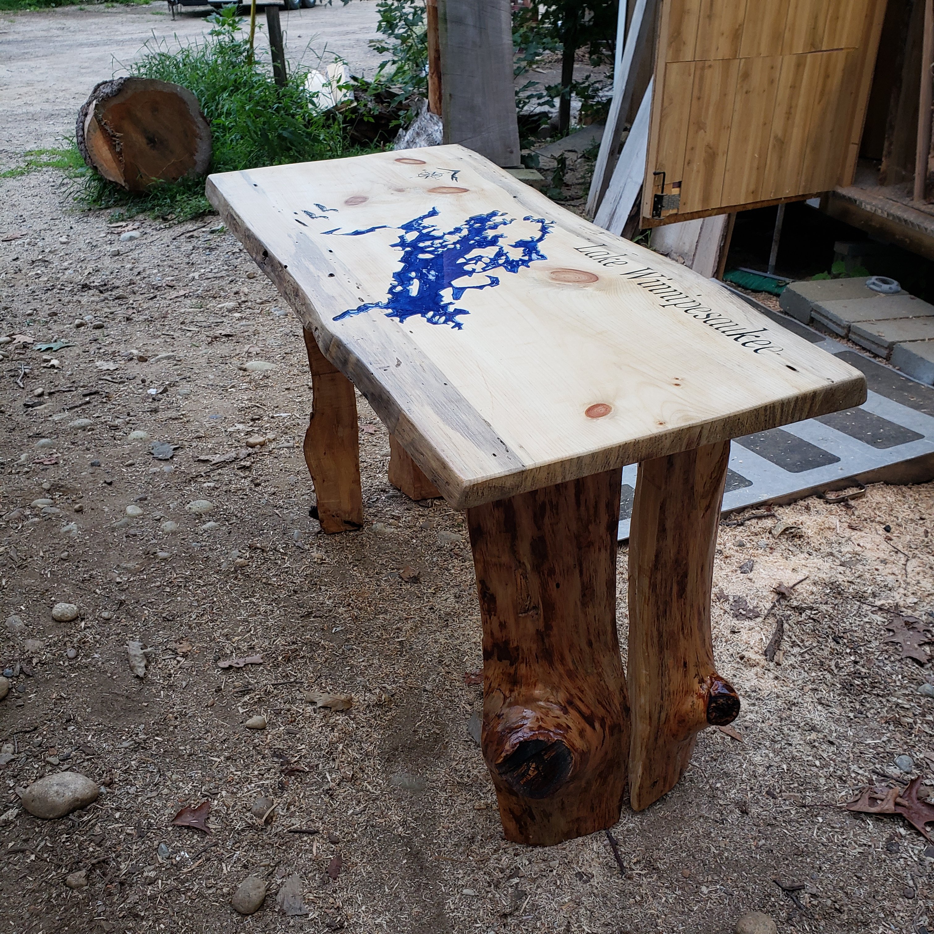 23×56 and is 30″ tall. Made out of pine w hemlock chainsaw carved legs. Has georgouse knots and urethane coated. $725. I will have at the Wolfeboro show. And can always make you one on special order.