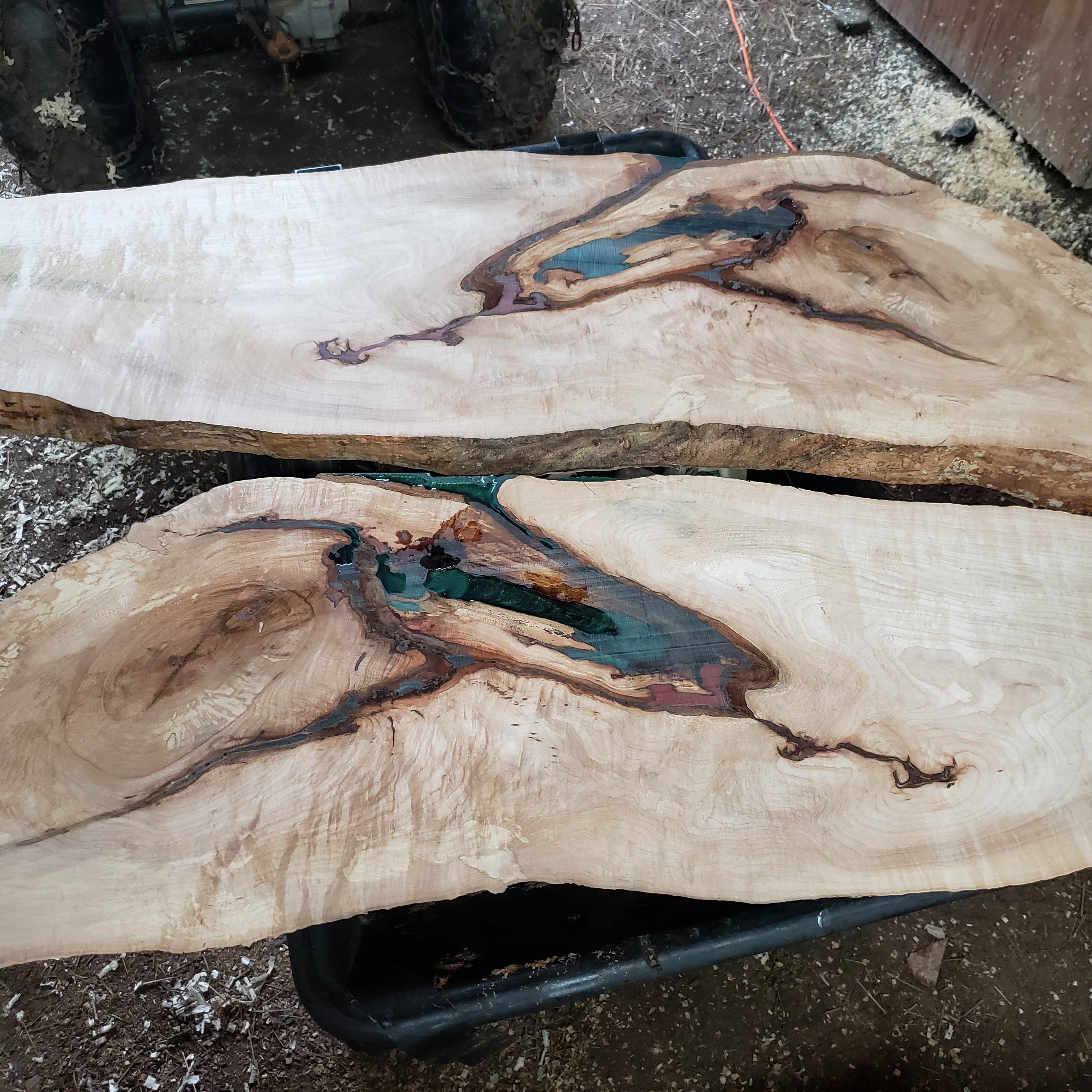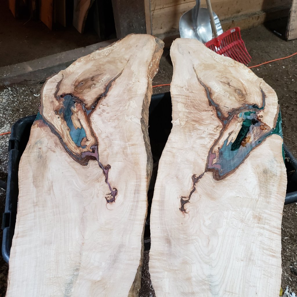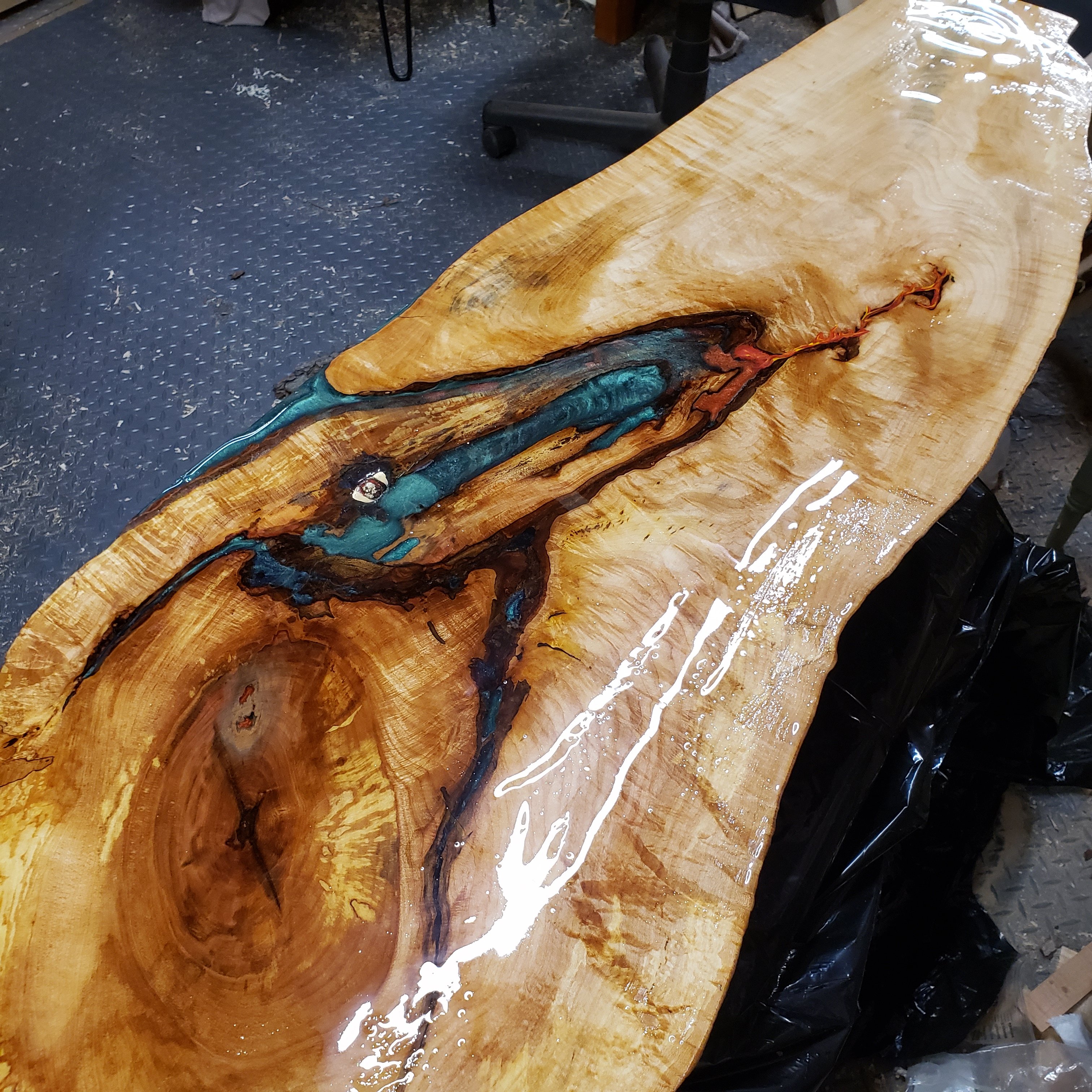 Both have sold. Please watch for more.. thank you.. New Epoxy filled Dragon Tables w natural design Maple has curley, Spalding and some kind of Meteorite circles on the outside and in the grain. Never seen this before. These2 tables are for sale. Text me if interested. Can also turn into 1 large table. 5′ long and 18″ on widest spot. I will post more pictures when done w legs and another awesome feature I added.