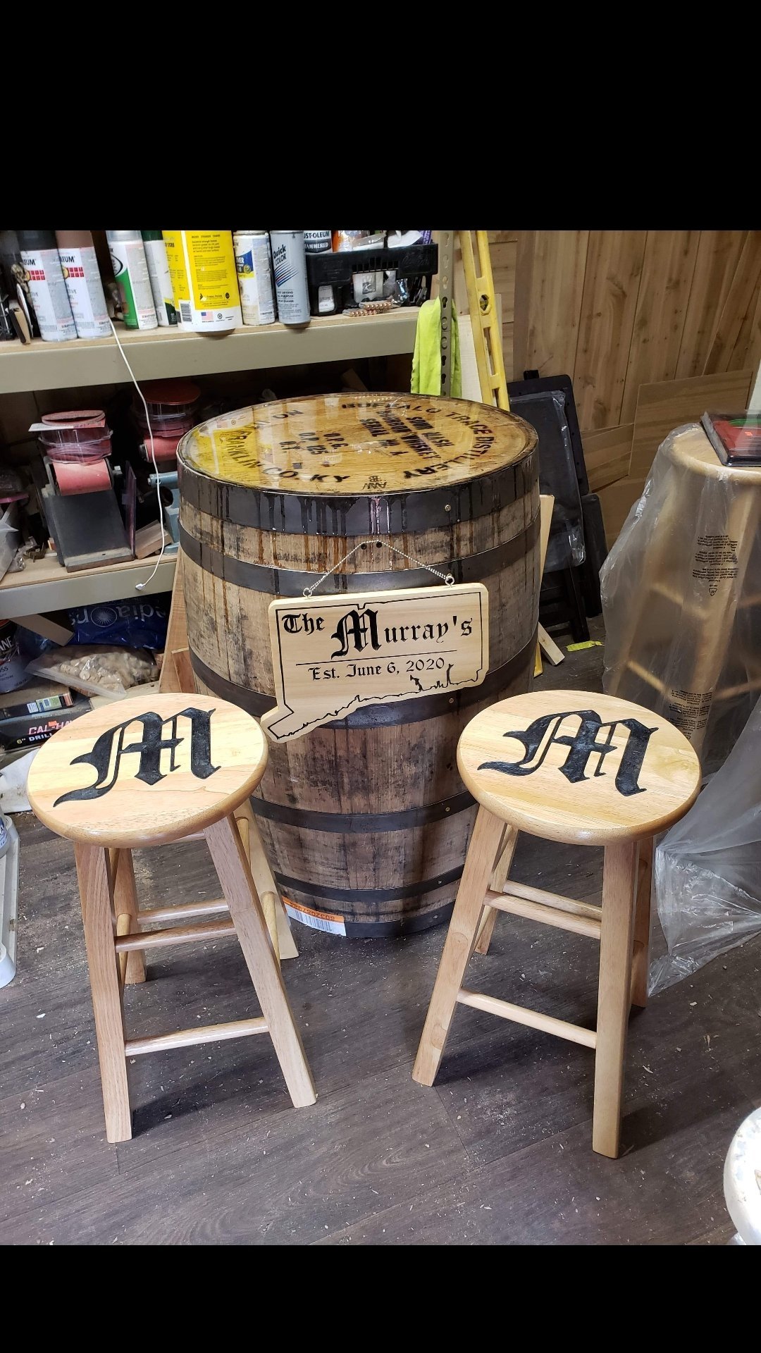 Wedding present from a few years back. I epoxies stools and whiskey barrel top.. Came out really nice and still looks good today.