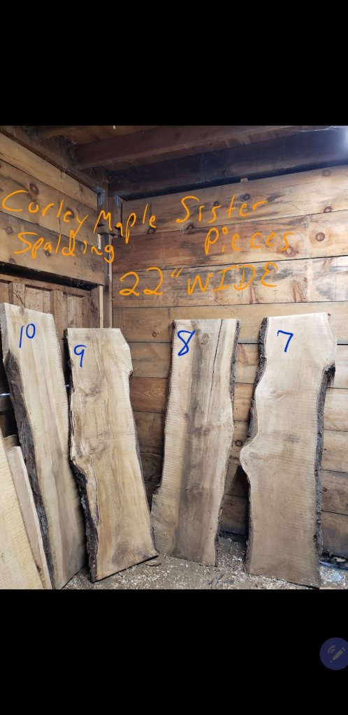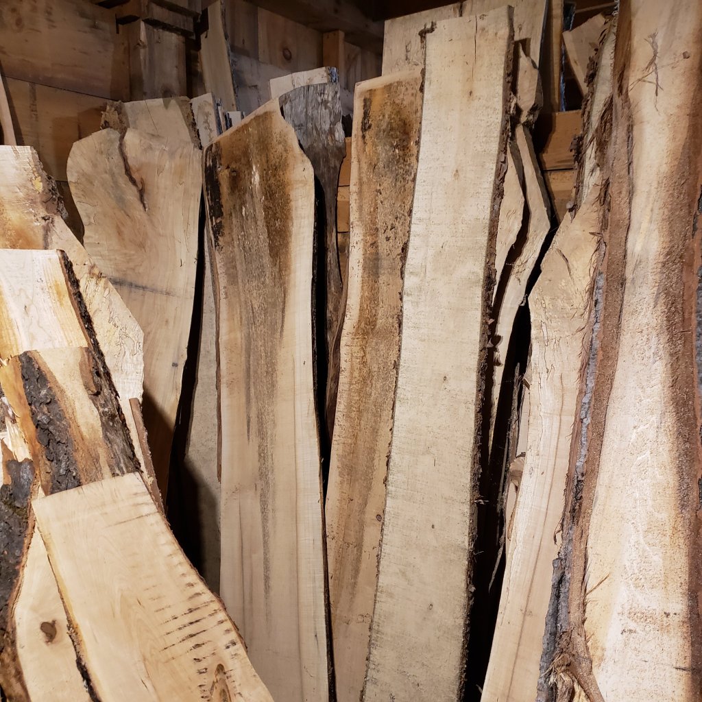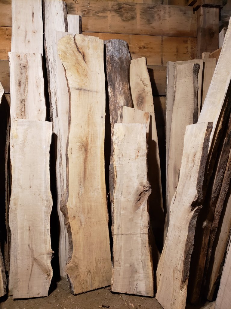 Slabs of Wood for sale. Tons of Selections! Maple, curley maple, spalded maple, cherry, white birch, black walnut, quilted maple, large pine slabs, hemlock, and newest old wood, SPALDED HICKORY!