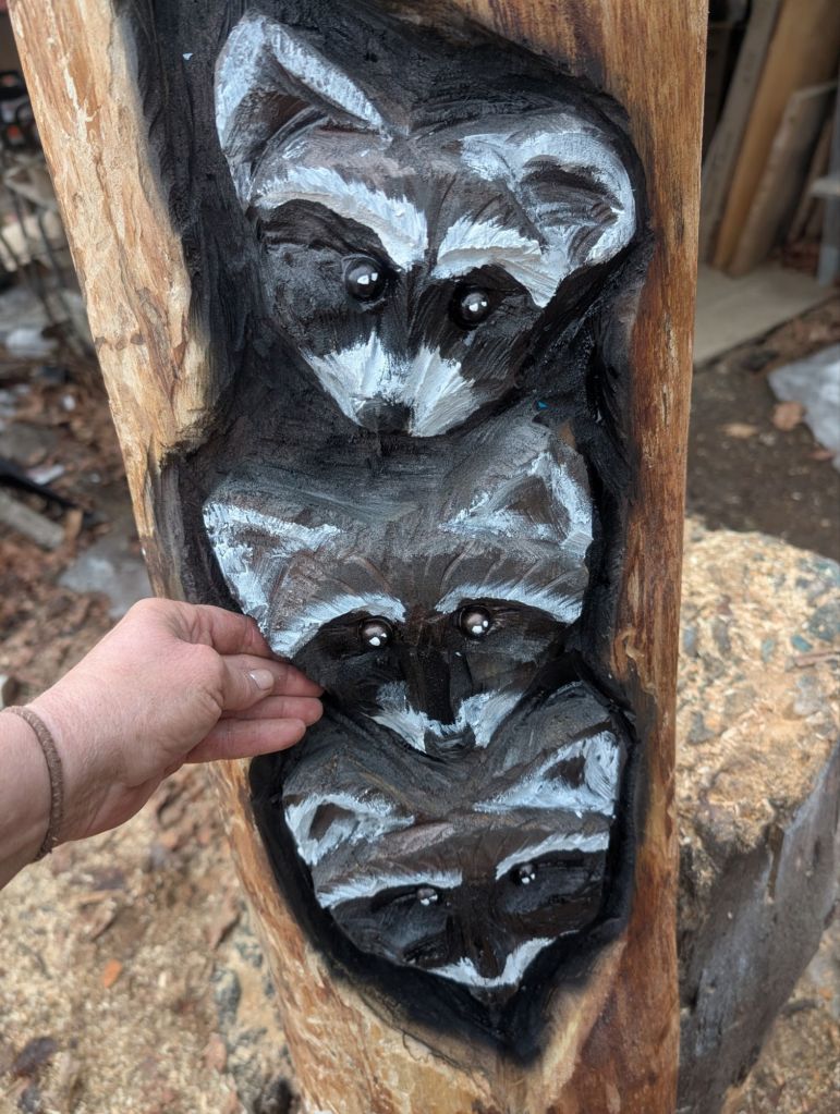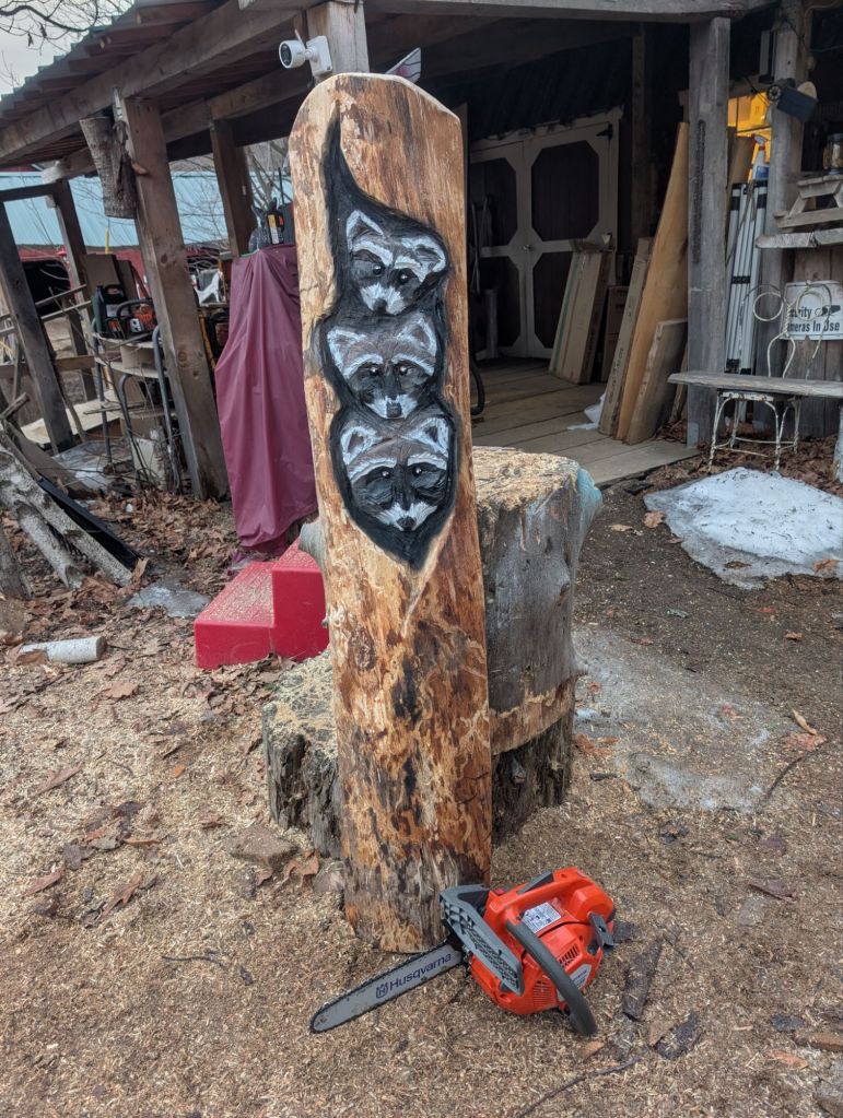 I just finished my first raccoons coming out of a tree hole from a Long Winter. The piece of wood is a white Birch. It stands a little over 4 ft tall. You can always shorten it. If it’s too tall, lean it up against another tree or your house or a post. $225
