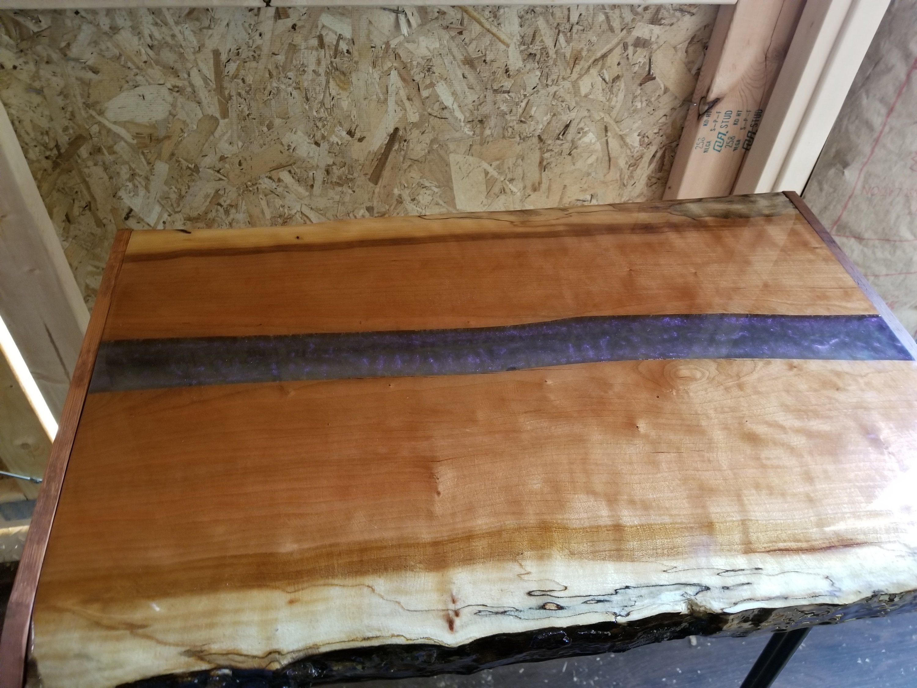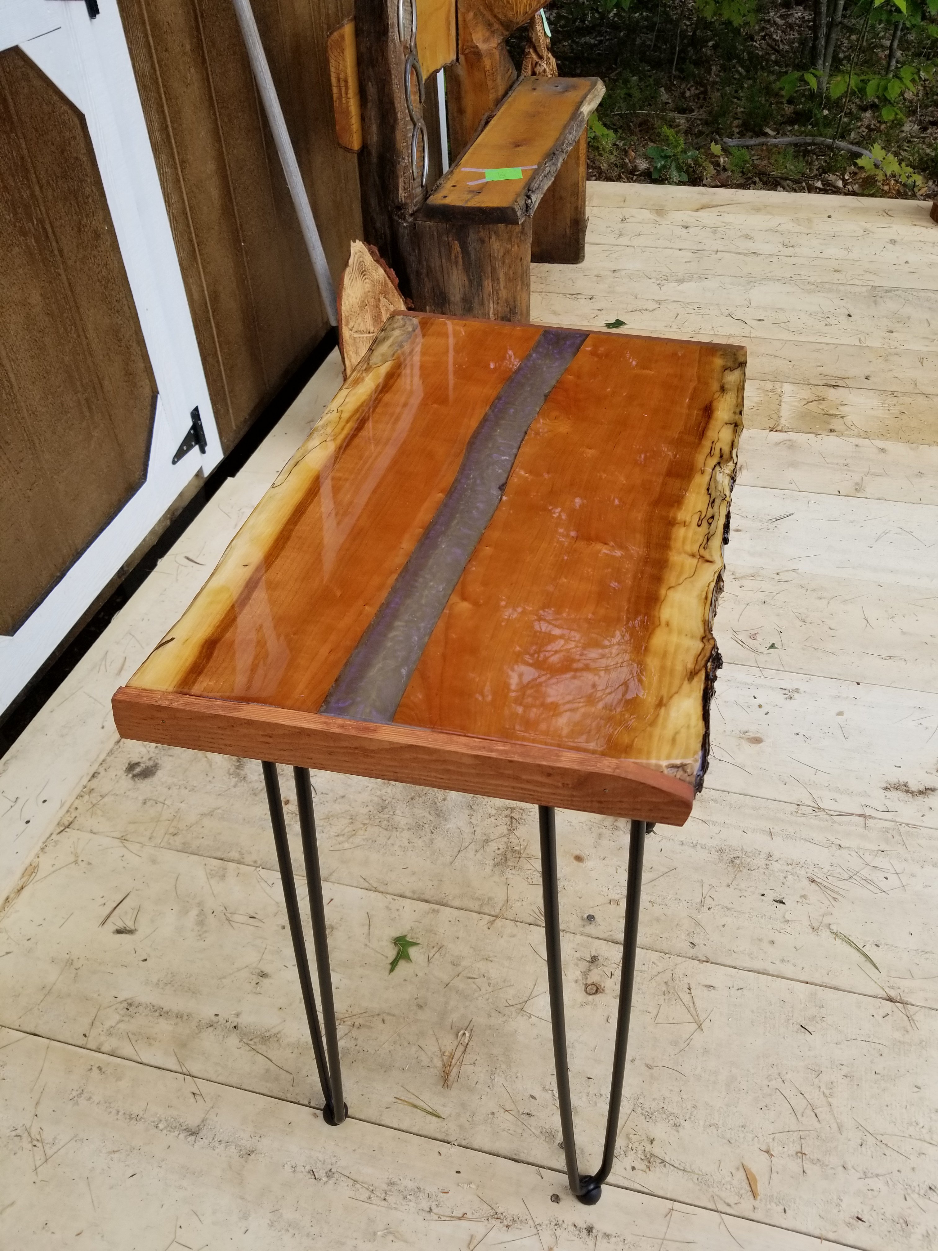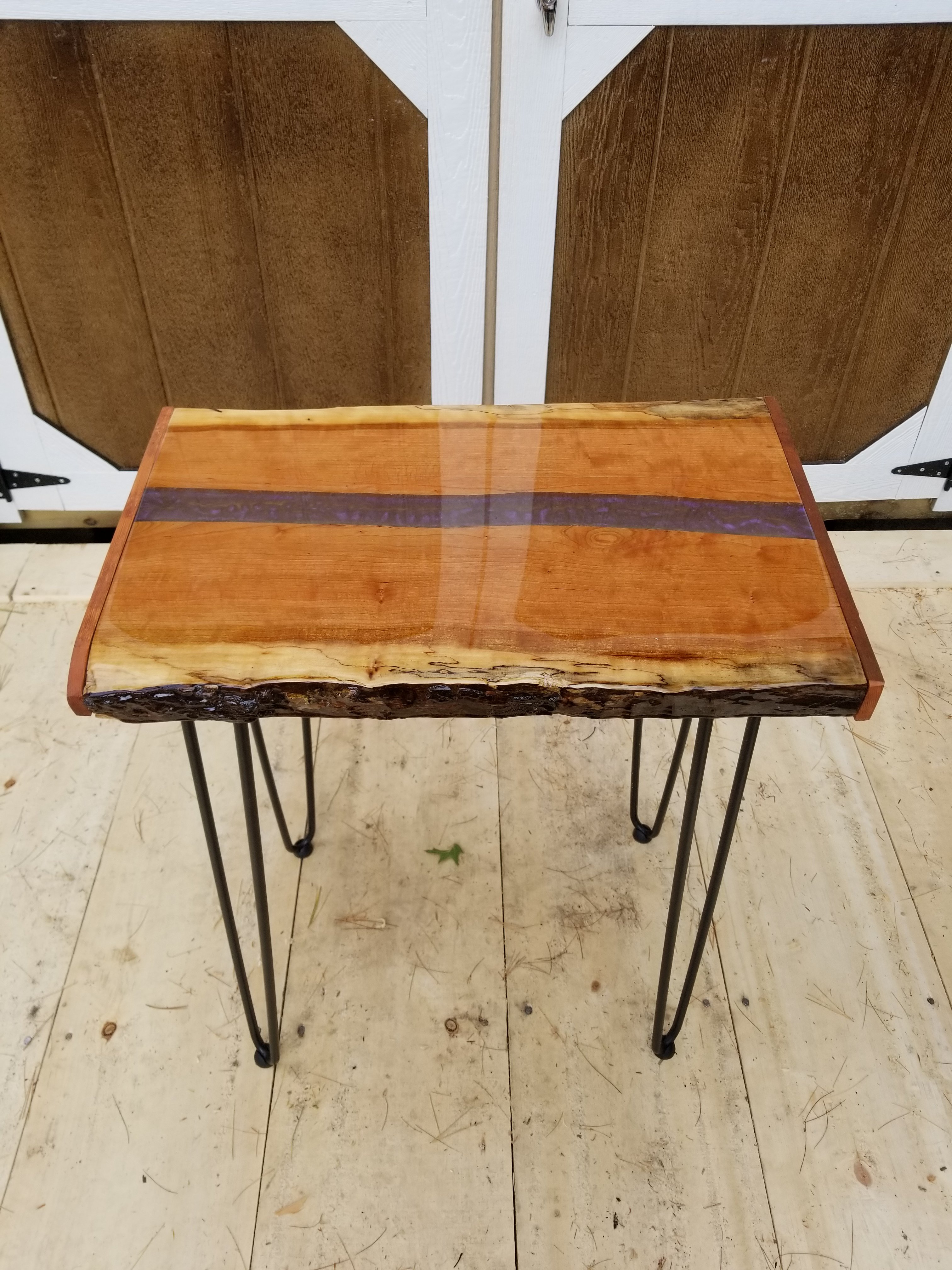 This table is still available as of 10-22-18. You can purchase by clicking on Paypal, or text me to confirm and pay. 603-759-4606. Made w cherry wood, stands approx 20″ tall. Is covered w an unbelievably liquid smooth appoxy that you can’t stop touching! With a metallic purple resin running thru the middle. You can put led lights underneath to give that final unique touch. Also attached is a web link to the poly company I used to make these stunning tables. Visit to see amazing designs and art. Http://lddy.no/69pk.