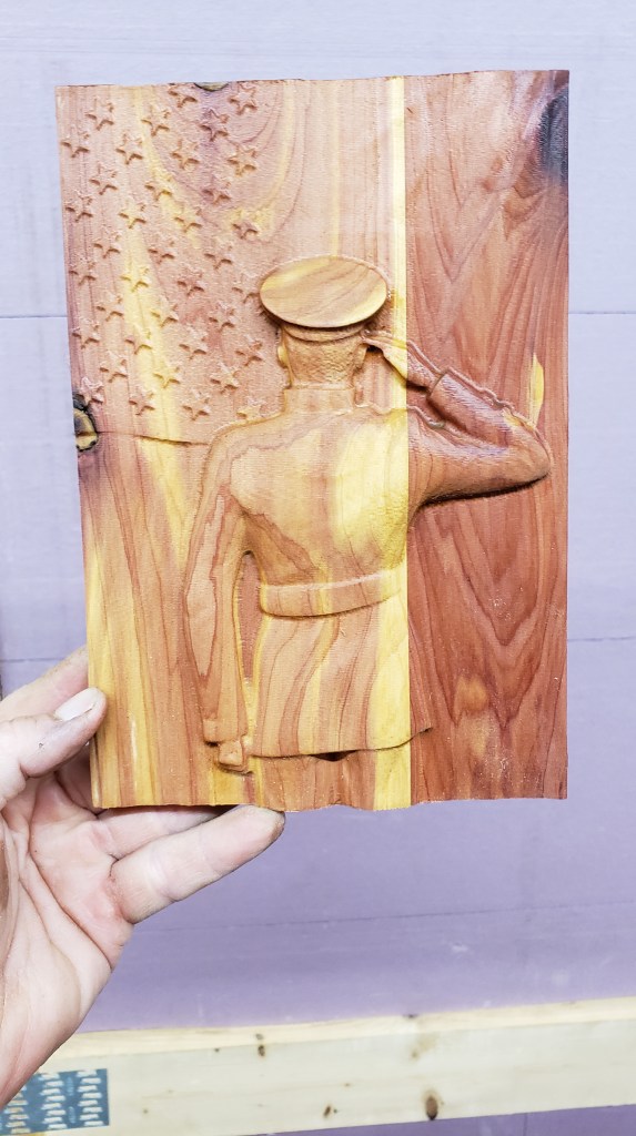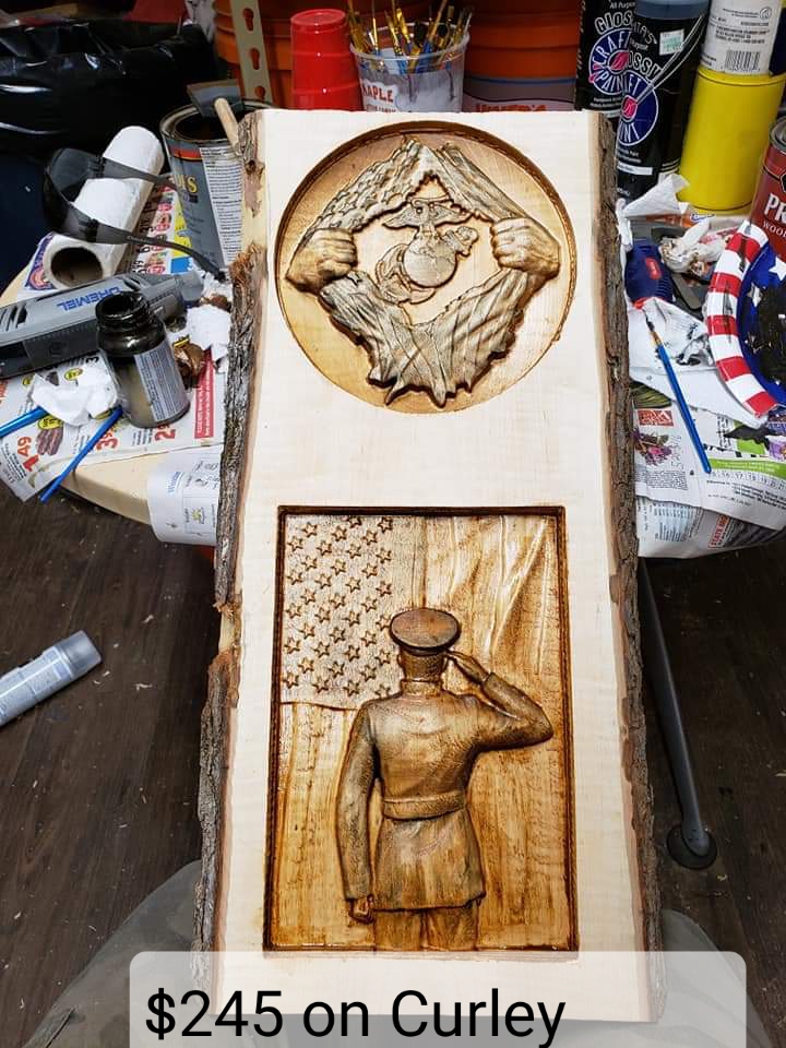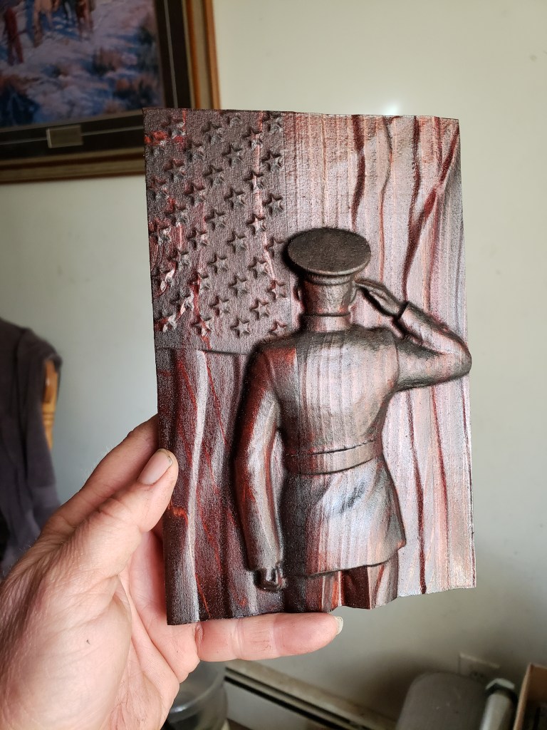 This beautiful wood carvings that are 3-D of my soldier salute are approximately 5" wide by 8" tall can make to any size on special orders can make to hang on a wall or I have some small metal stands for an additional $5 calling is the best way to reach me via text phone number is 603 - 759 - 4606