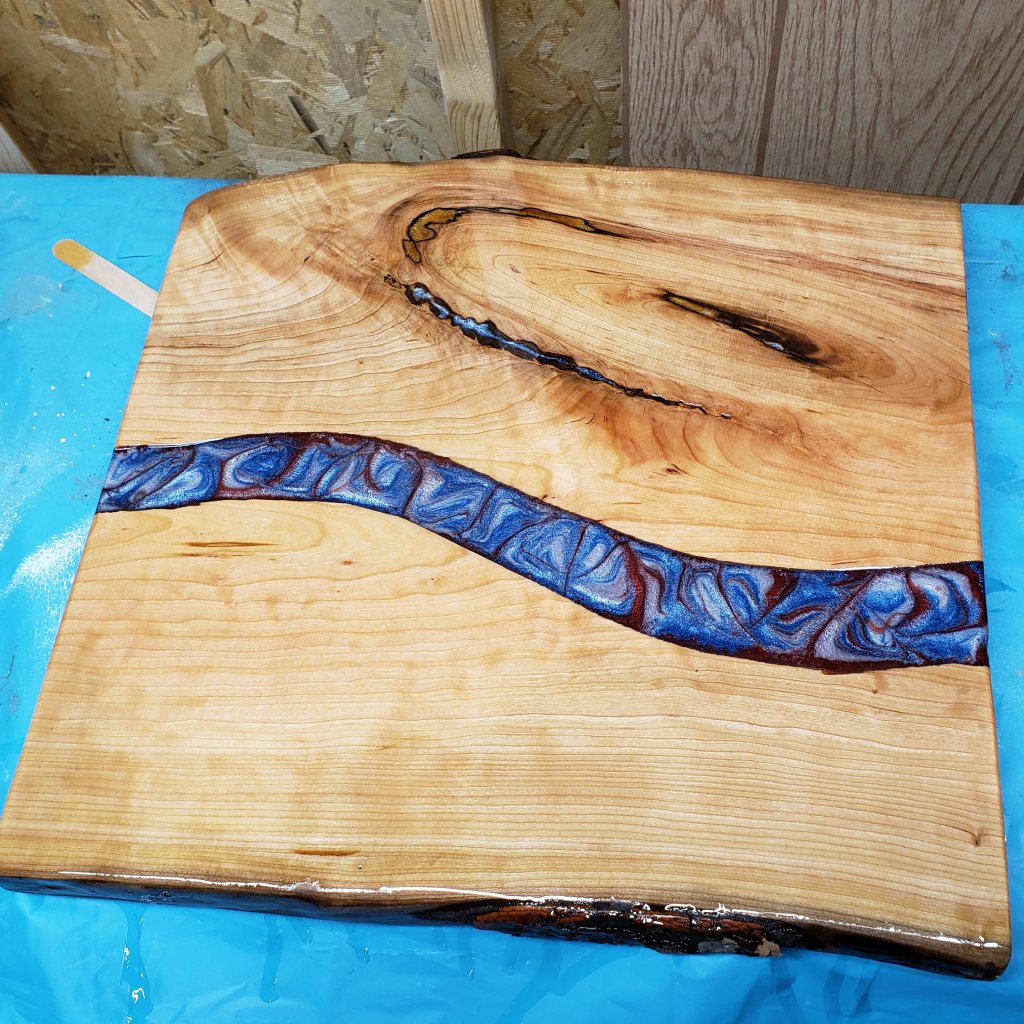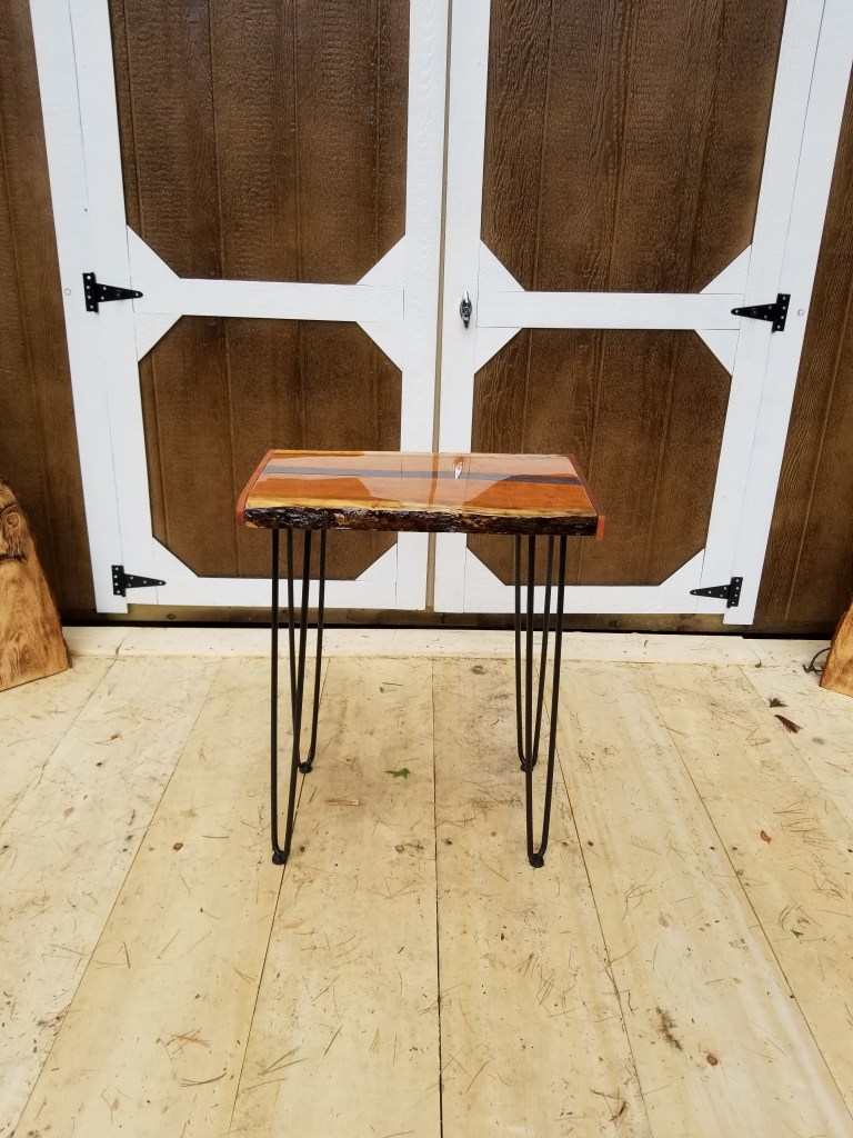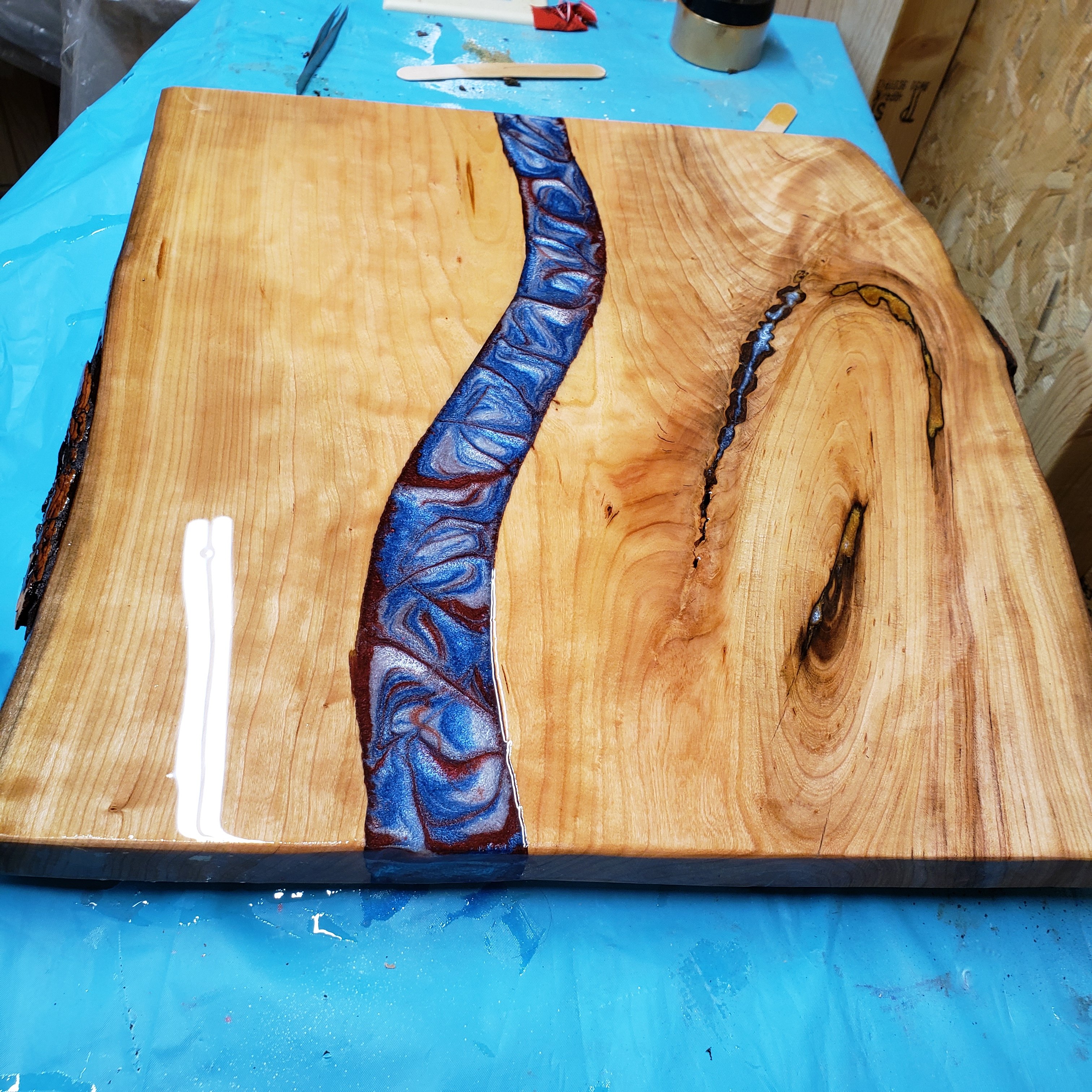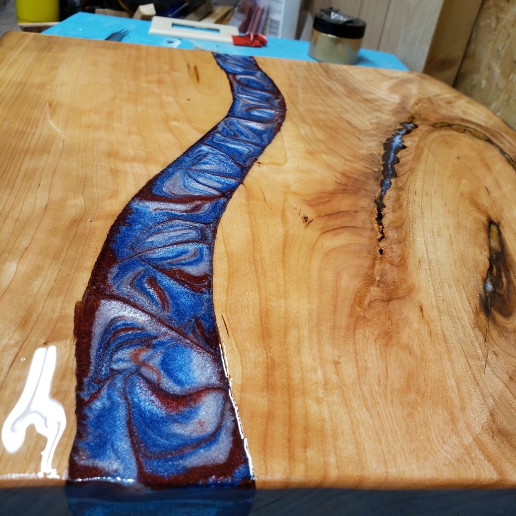 Cherry wood, Epoxy end table, with beautiful River of epoxy patriotic colors that took over its own design as it cooked. I’m loving it. Few more coats. Then legs. Nice end table. 17″×19″