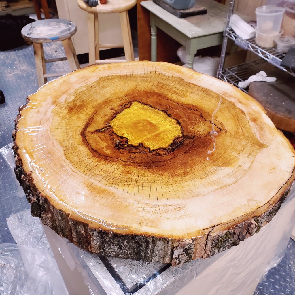 Heres a wonderful new Beefy Epoxy Pour. Rock Maple also known as the Maple syrup trees. I filled w gold color center to bring out the beauty. I will post more when finished. It is for sale.